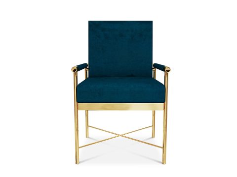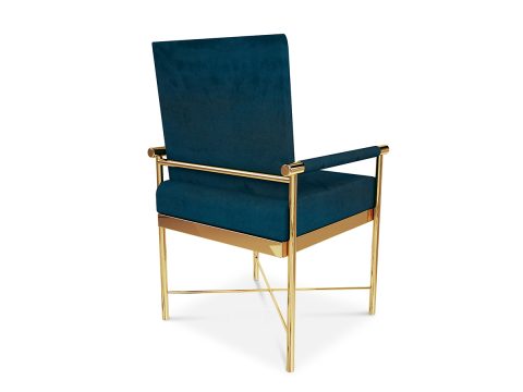Contemporary dining chair made of gold plated stainless steel and upholstered with velvet.