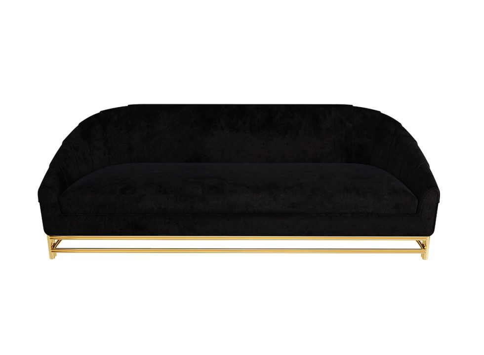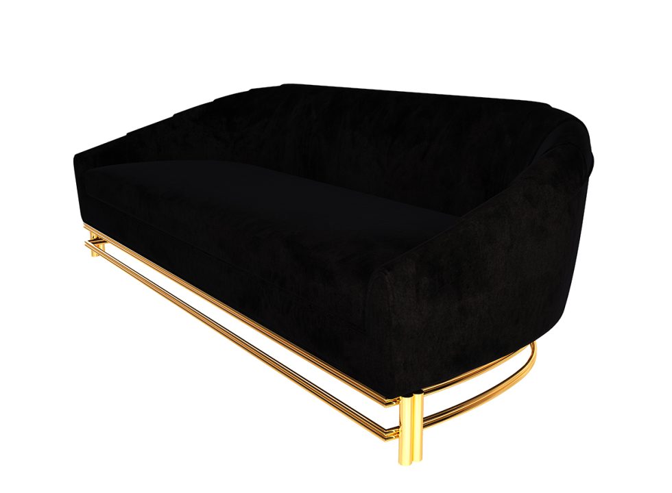 This luxury contemporary sofa features a base made of polished brass. The structure is upholstered with black velvet.